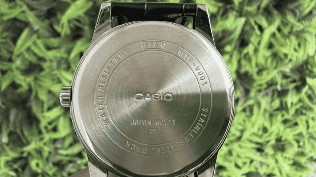 Diferente de algumas marcas de luxo que gravam o serial no mostrador, na Casio a “identidade” fica no verso. O número de série e o código do módulo (4 dígitos dentro de um retângulo) estão gravados em baixo relevo na tampa de aço traseira (caseback). Em modelos originais, essa gravação é nítida, profunda e perfeitamente alinhada.